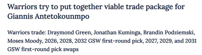 首先我们来看ESPN给出的潜在交易方案:勇士送出德雷蒙德・格林、库明加、波杰姆斯基、穆迪四位即战力球员,外加2026年、2028年、2032年的3个首轮选秀权以及2027年、2029年、2031年3个首轮互换权,勇士将从雄鹿得到字母哥、科尔安东尼以及普林斯!这笔交易方案将勇士的夺冠野心摆上了台面,字母哥联手巴特勒、库里组成足以令联盟闻风丧胆的三巨头阵容,雄鹿则得到6个首轮签作为补偿,那么这两支球队真的能实现双赢吗?